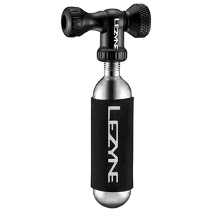 CNC control knob twists for easy and controlled inflation. Twin Slip Chuck head presses on to Presta and Schrader valves. Neoprene sleeve insulates hand from cold during discharge. Compatible with threaded CO2 cartridges. Includes one 16g or 25g cartridge.