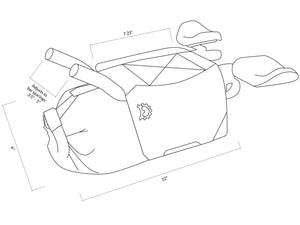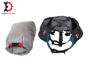 The seam taped Ultra 200 UHMWPE drybag has an asymmetrical tapered bottom for stem clearance and is sized to fit a light sleeping/shelter system or warm clothing and rain gear. A removable front strap can be used to tension the front of the drybag if using it fully packed on rough terrain. The drybag is secured to the holster with spring loaded, non-dangling auto cam buckles.