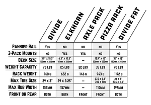 Carry up to 70lbs - The Divide is ready to confidently carry up to 55lbs/25kg when eyelet mounted and 70lbs/31.75kg when axle mounted with one of our Fit Kits, whether you’re on smooth pavement, a rugged rock garden, or with your tires off the ground.