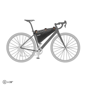 low center of gravity so that the trail fun remains high even when fully loaded. The roll closure and its large opening allow easy access andeasy packing of the bag. The assembly within the frame triangle is done with strong and robust Velcro fasteners.The specific positioning of the Velcro straps along the circumference of the bag enables individual adjustment to the dimensions of your bike. The Frame Pack RC is