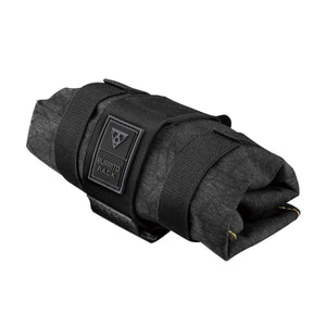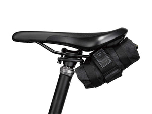 A compact roll-up with three compartments and internal organizers to keep gear and small items neatly in place. The durable water repellent and stain resistant coating keeps contents dry and cleans up easily. Secure strap provides tool-free mounting to frame tube, seat post or to saddle rails.