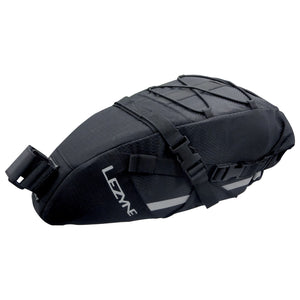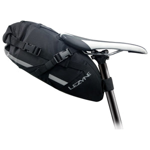 Securely mounts to seat post and seat rails with strategically placed straps to keep bag stable. High quality, durable materials. Roll-style enclosure makes for easy loading and compresses gear tightly. External draw cords hold extra gear. Reflective features and light mounts add additional safety. Highly water resistant construction.